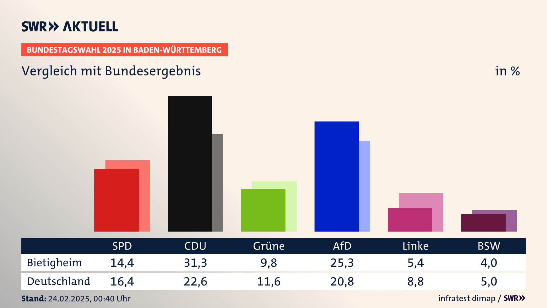 In Bietigheim verliert die SPD stark (-9,5 Prozentpunkte) und erzielt 14,4 Prozent der gültigen Stimmen. Die CDU erreicht 31,3 Prozent und gewinnt stark (+6,0 Prozentpunkte). Die Grünen erzielen 9,8 Prozent und verlieren deutlich (-3,1 Prozentpunkte). Die FDP verliert stark (-8,9 Prozentpunkte) und kommt auf 4,9 Prozent. Die AfD erreicht 25,3 Prozent und gewinnt stark (+12,4 Prozentpunkte). Die Linke erzielt 5,4 Prozent und gewinnt leicht (+2,9 Prozentpunkte). Die 2021 nicht angetretene Partei BSW bekommt 4,0 Prozent.