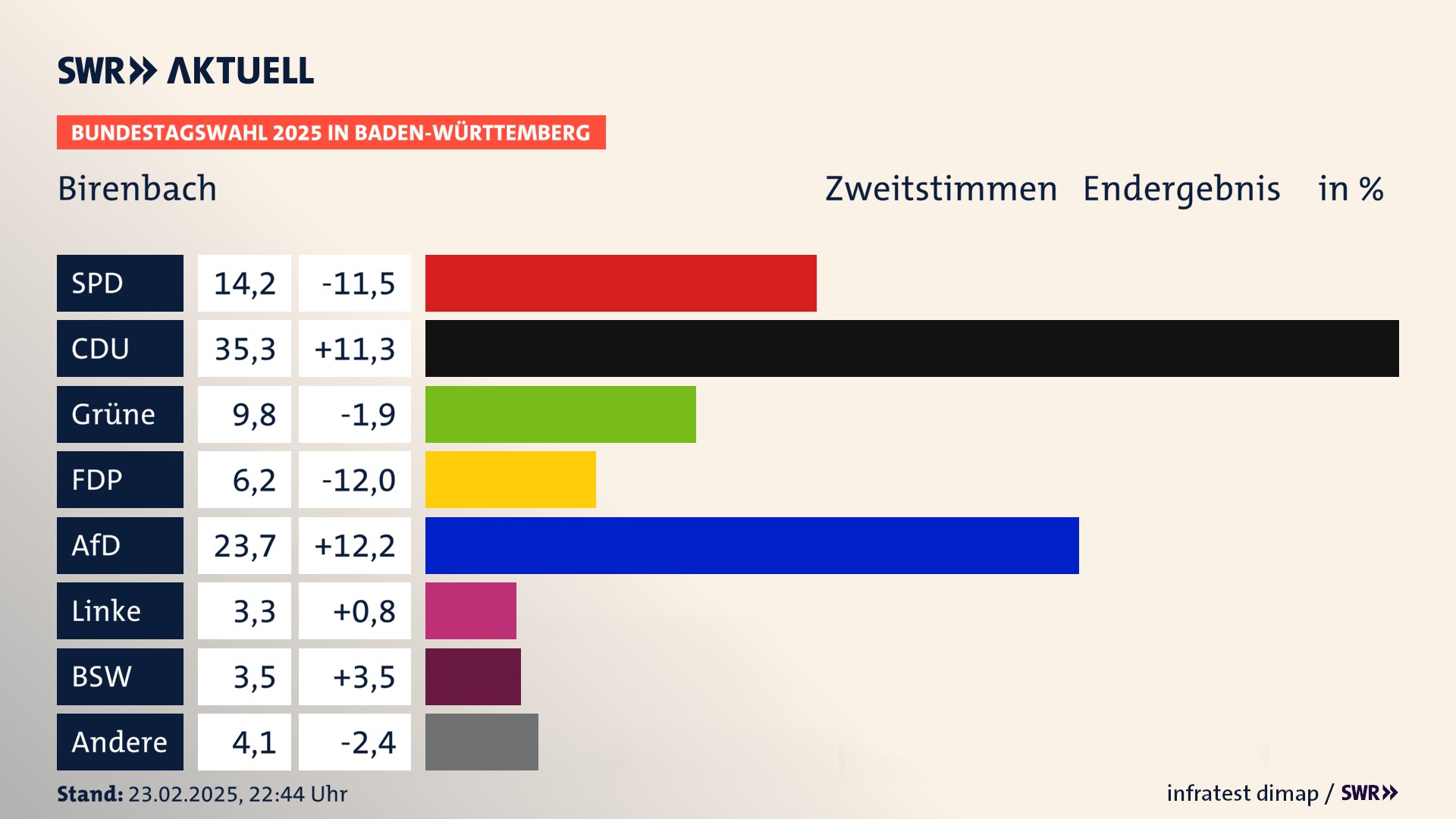 In Birenbach verliert die SPD stark (-11,5 Prozentpunkte) und erzielt 14,2 Prozent der gültigen Stimmen. Die CDU erreicht 35,3 Prozent und gewinnt stark (+11,3 Prozentpunkte). Die Grünen erzielen 9,8 Prozent und verlieren leicht (-1,9 Prozentpunkte). Die FDP verliert stark (-12,0 Prozentpunkte) und kommt auf 6,2 Prozent. Die AfD erreicht 23,7 Prozent und gewinnt stark (+12,2 Prozentpunkte). Die Linke erzielt 3,3 Prozent und gewinnt leicht (+0,8 Prozentpunkte). Die 2021 nicht angetretene Partei BSW bekommt 3,5 Prozent.