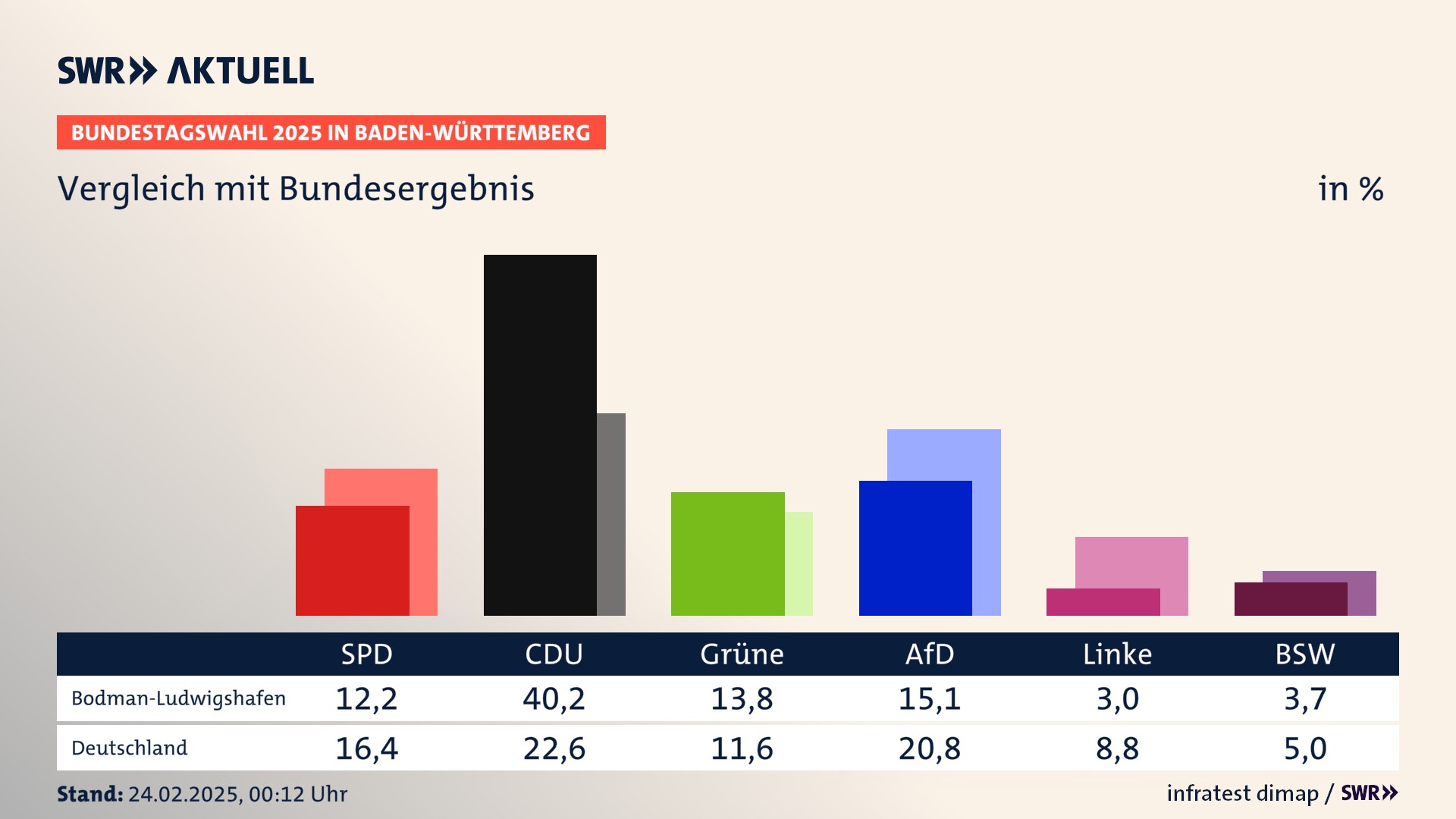 In Bodman-Ludwigshafen verliert die SPD stark (-7,1 Prozentpunkte) und erzielt 12,2 Prozent der gültigen Stimmen. Die CDU erreicht 40,2 Prozent und gewinnt stark (+11,5 Prozentpunkte). Die Grünen erzielen 13,8 Prozent und verlieren deutlich (-4,0 Prozentpunkte). Die FDP verliert stark (-11,3 Prozentpunkte) und kommt auf 7,4 Prozent. Die AfD erreicht 15,1 Prozent und gewinnt stark (+8,2 Prozentpunkte). Die Linke erzielt 3,0 Prozent und gewinnt leicht (+1,0 Prozentpunkte). Die 2021 nicht angetretene Partei BSW bekommt 3,7 Prozent.