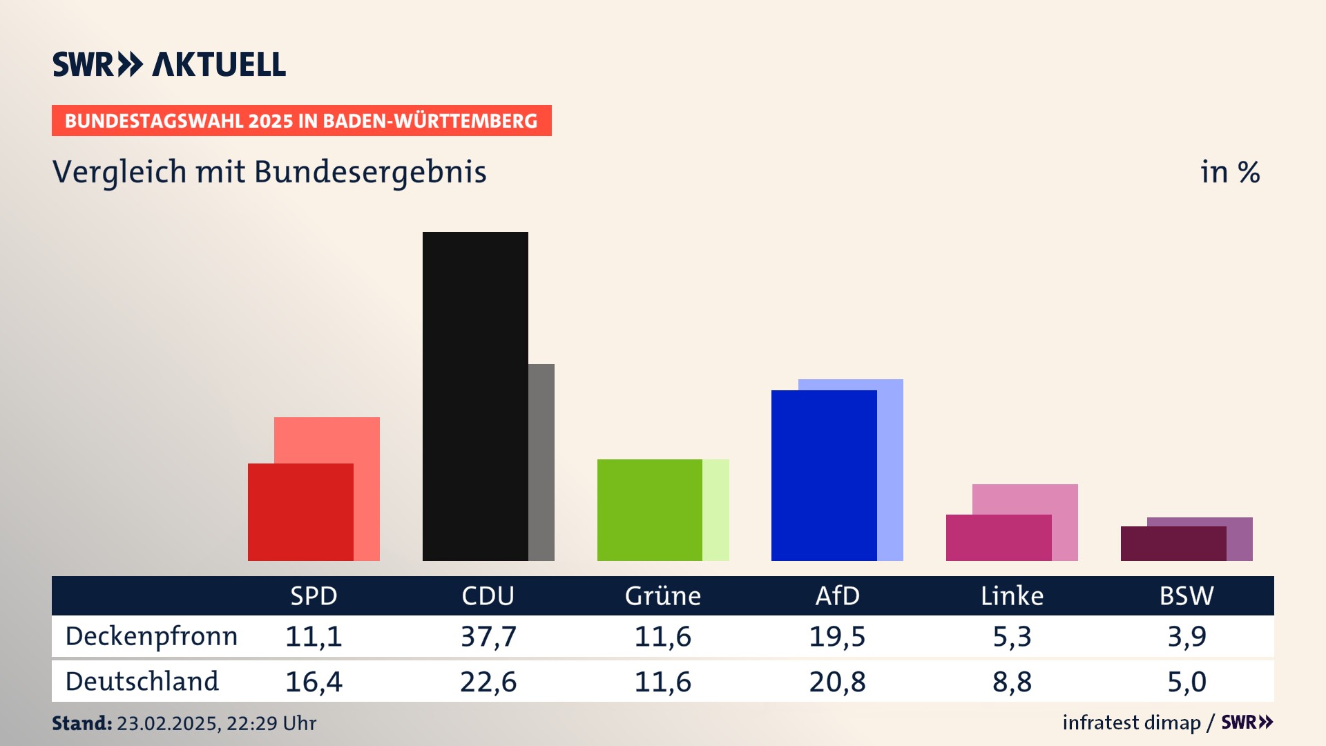 In Deckenpfronn verliert die SPD stark (-6,6 Prozentpunkte) und erzielt 11,1 Prozent der gültigen Stimmen. Die CDU erreicht 37,7 Prozent und gewinnt stark (+8,8 Prozentpunkte). Die Grünen erzielen 11,6 Prozent und verlieren leicht (-1,1 Prozentpunkte). Die FDP verliert stark (-12,3 Prozentpunkte) und kommt auf 6,3 Prozent. Die AfD erreicht 19,5 Prozent und gewinnt stark (+8,4 Prozentpunkte). Die Linke erzielt 5,3 Prozent und gewinnt deutlich (+3,0 Prozentpunkte). Die 2021 nicht angetretene Partei BSW bekommt 3,9 Prozent.