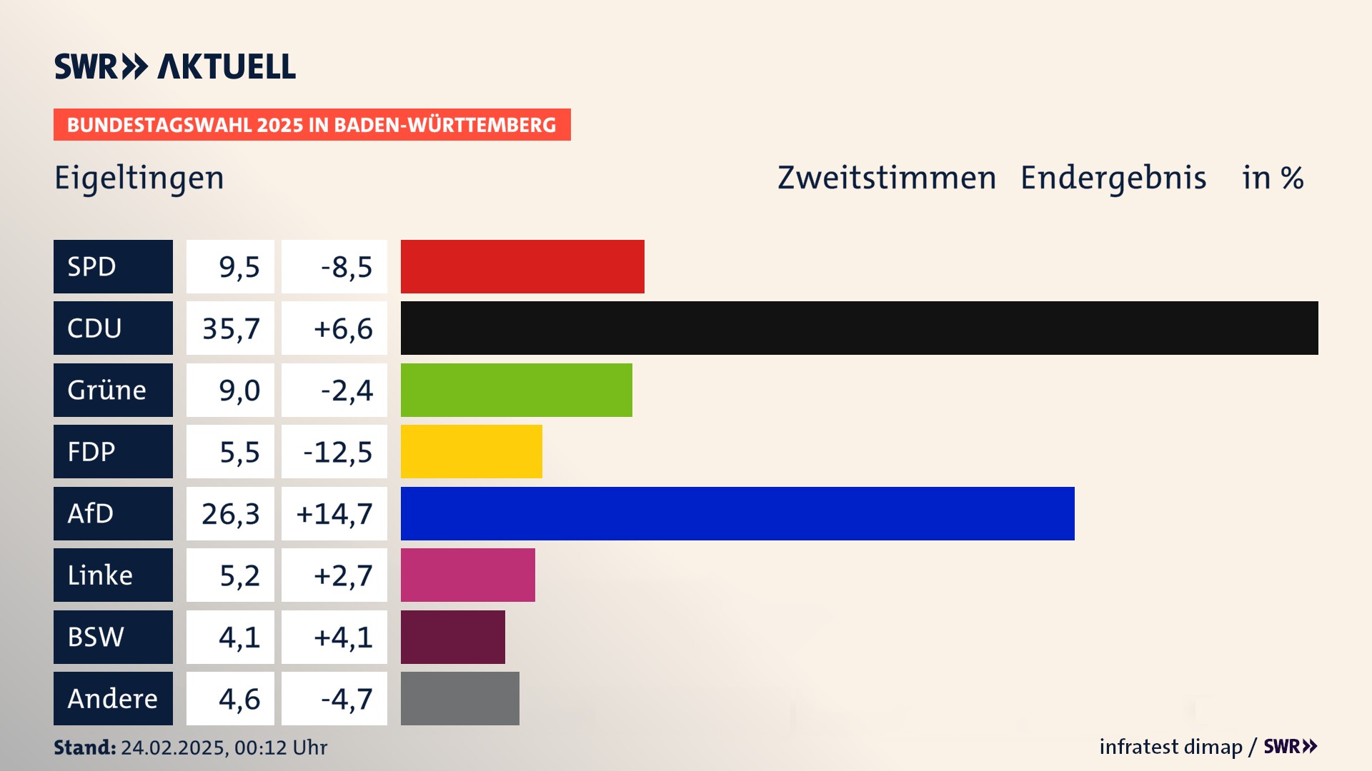 In Eigeltingen verliert die SPD stark (-8,5 Prozentpunkte) und erzielt 9,5 Prozent der gültigen Stimmen. Die CDU erreicht 35,7 Prozent und gewinnt stark (+6,6 Prozentpunkte). Die Grünen erzielen 9,0 Prozent und verlieren leicht (-2,4 Prozentpunkte). Die FDP verliert stark (-12,5 Prozentpunkte) und kommt auf 5,5 Prozent. Die AfD erreicht 26,3 Prozent und gewinnt stark (+14,7 Prozentpunkte). Die Linke erzielt 5,2 Prozent und gewinnt leicht (+2,7 Prozentpunkte). Die 2021 nicht angetretene Partei BSW bekommt 4,1 Prozent.