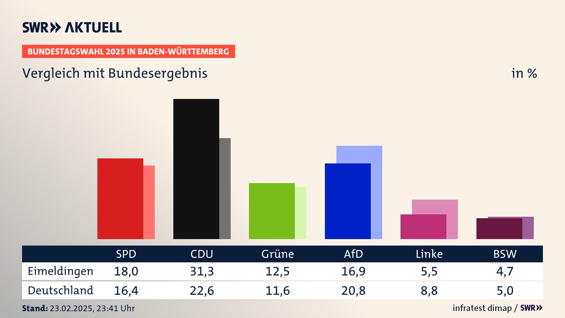 In Eimeldingen verliert die SPD stark (-6,3 Prozentpunkte) und erzielt 18,0 Prozent der gültigen Stimmen. Die CDU erreicht 31,3 Prozent und gewinnt stark (+9,4 Prozentpunkte). Die Grünen erzielen 12,5 Prozent und verlieren stark (-5,0 Prozentpunkte). Die FDP verliert stark (-11,0 Prozentpunkte) und kommt auf 5,4 Prozent. Die AfD erreicht 16,9 Prozent und gewinnt stark (+9,4 Prozentpunkte). Die Linke erzielt 5,5 Prozent und gewinnt leicht (+2,9 Prozentpunkte). Die 2021 nicht angetretene Partei BSW bekommt 4,7 Prozent.