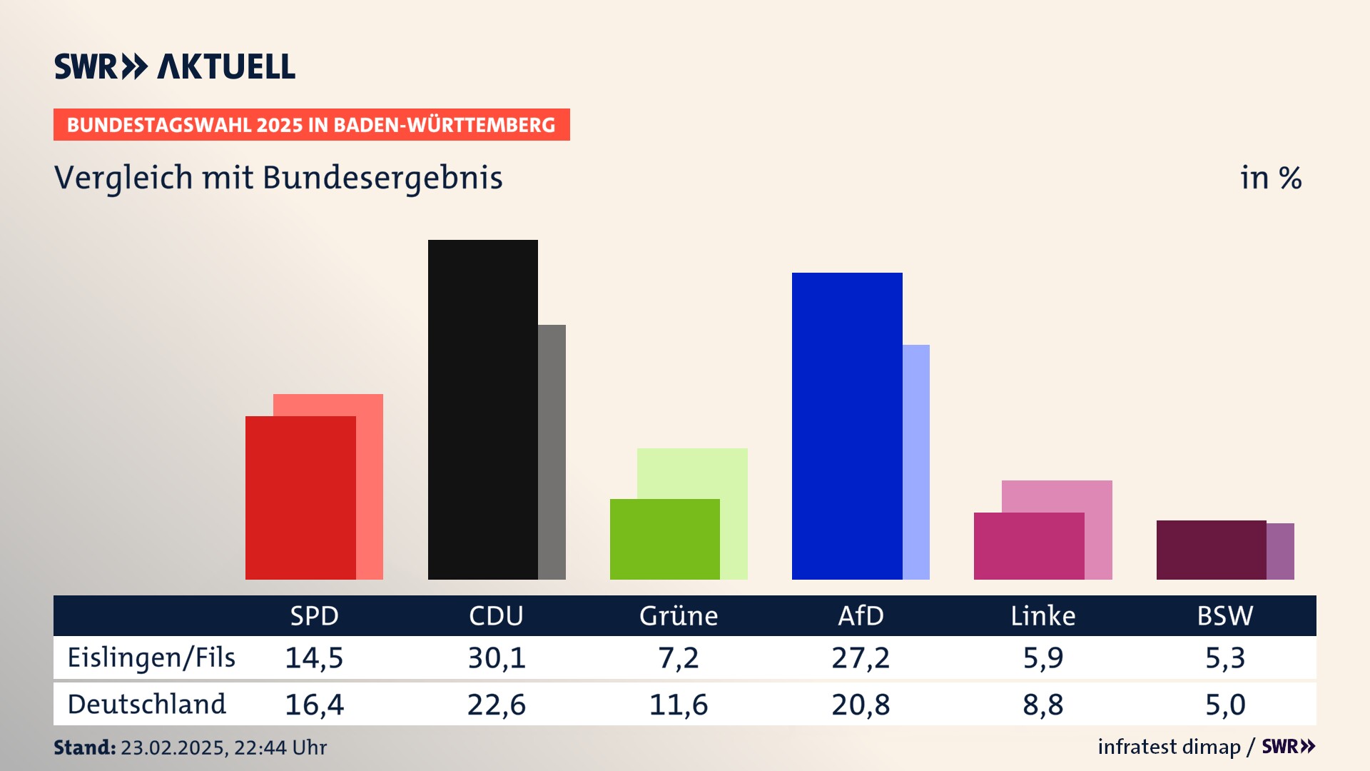 In Eislingen/Fils verliert die SPD stark (-9,3 Prozentpunkte) und erzielt 14,5 Prozent der gültigen Stimmen. Die CDU erreicht 30,1 Prozent und gewinnt stark (+5,0 Prozentpunkte). Die Grünen erzielen 7,2 Prozent und verlieren deutlich (-3,9 Prozentpunkte). Die FDP verliert stark (-9,9 Prozentpunkte) und kommt auf 5,2 Prozent. Die AfD erreicht 27,2 Prozent und gewinnt stark (+13,1 Prozentpunkte). Die Linke erzielt 5,9 Prozent und gewinnt deutlich (+3,4 Prozentpunkte). Die 2021 nicht angetretene Partei BSW bekommt 5,3 Prozent.