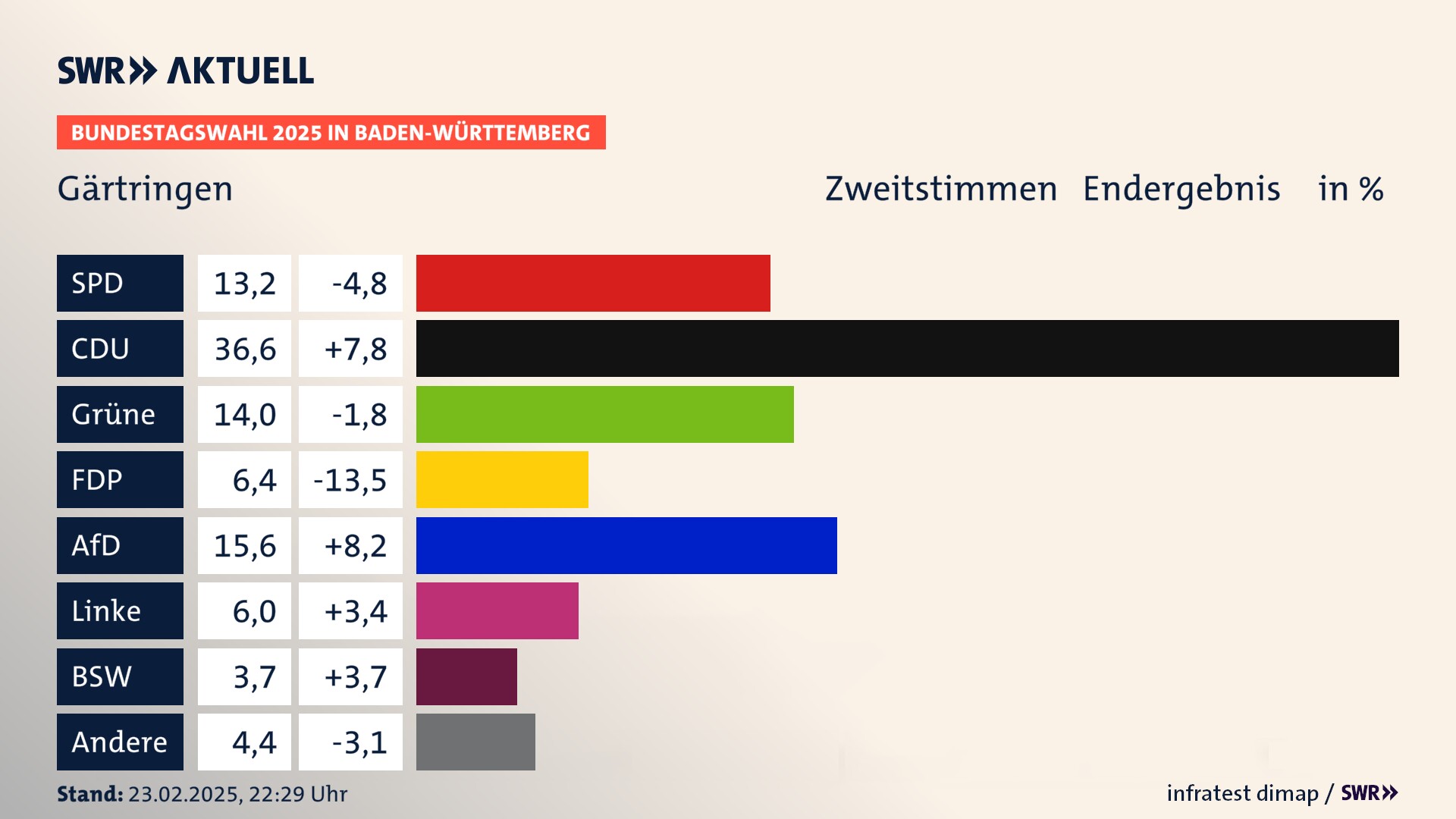 In Gärtringen verliert die SPD deutlich (-4,8 Prozentpunkte) und erzielt 13,2 Prozent der gültigen Stimmen. Die CDU erreicht 36,6 Prozent und gewinnt stark (+7,8 Prozentpunkte). Die Grünen erzielen 14,0 Prozent und verlieren leicht (-1,8 Prozentpunkte). Die FDP verliert stark (-13,5 Prozentpunkte) und kommt auf 6,4 Prozent. Die AfD erreicht 15,6 Prozent und gewinnt stark (+8,2 Prozentpunkte). Die Linke erzielt 6,0 Prozent und gewinnt deutlich (+3,4 Prozentpunkte). Die 2021 nicht angetretene Partei BSW bekommt 3,7 Prozent.