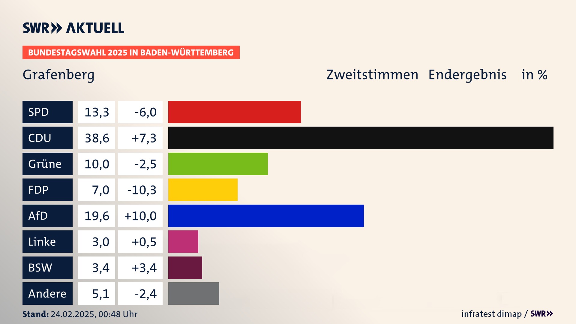 In Grafenberg verliert die SPD stark (-6,0 Prozentpunkte) und erzielt 13,3 Prozent der gültigen Stimmen. Die CDU erreicht 38,6 Prozent und gewinnt stark (+7,3 Prozentpunkte). Die Grünen erzielen 10,0 Prozent und verlieren leicht (-2,5 Prozentpunkte). Die FDP verliert stark (-10,3 Prozentpunkte) und kommt auf 7,0 Prozent. Die AfD erreicht 19,6 Prozent und gewinnt stark (+10,0 Prozentpunkte). Die Linke erzielt 3,0 Prozent und gewinnt leicht (+0,5 Prozentpunkte). Die 2021 nicht angetretene Partei BSW bekommt 3,4 Prozent.