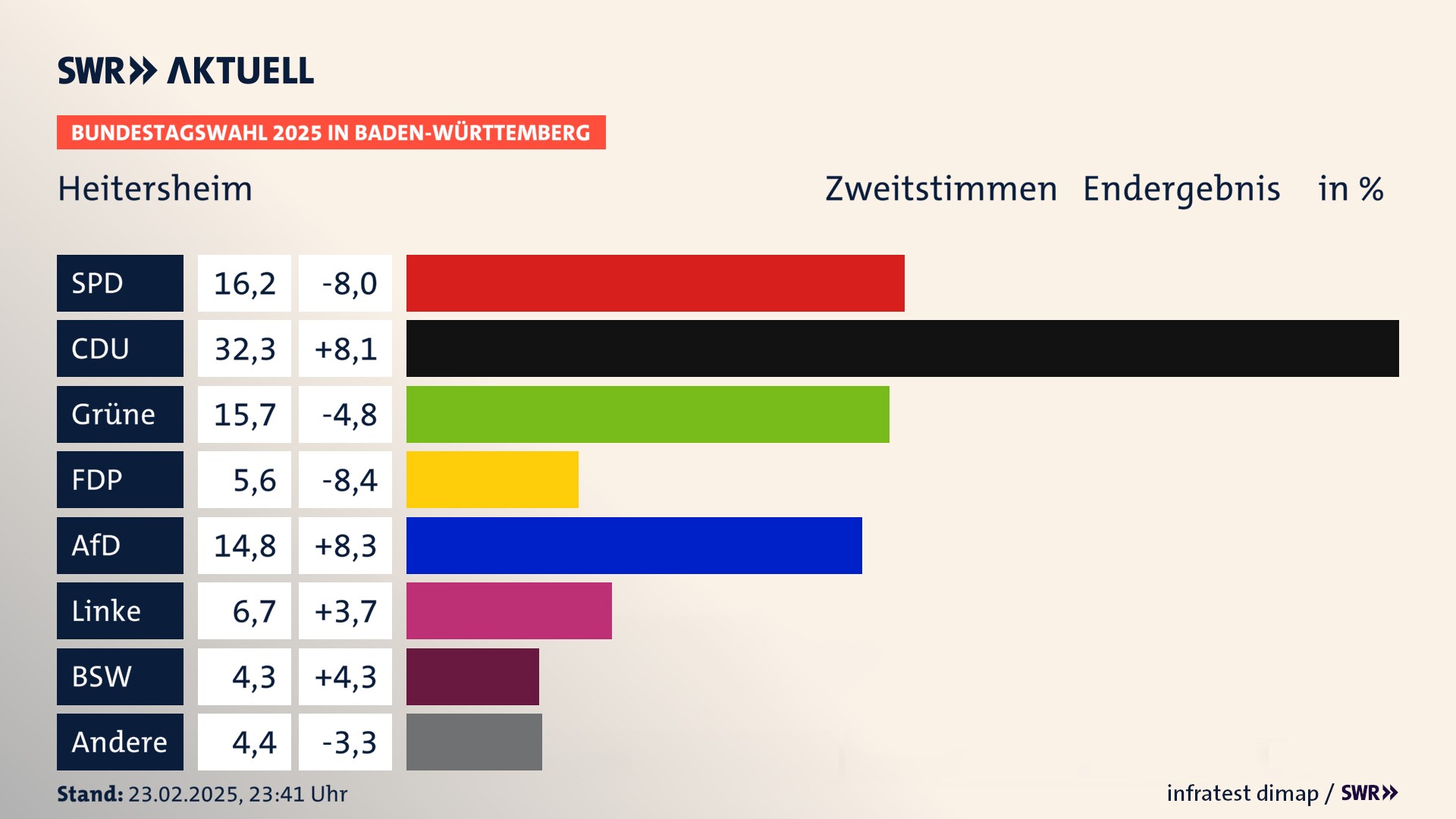In Heitersheim verliert die SPD stark (-8,0 Prozentpunkte) und erzielt 16,2 Prozent der gültigen Stimmen. Die CDU erreicht 32,3 Prozent und gewinnt stark (+8,1 Prozentpunkte). Die Grünen erzielen 15,7 Prozent und verlieren deutlich (-4,8 Prozentpunkte). Die FDP verliert stark (-8,4 Prozentpunkte) und kommt auf 5,6 Prozent. Die AfD erreicht 14,8 Prozent und gewinnt stark (+8,3 Prozentpunkte). Die Linke erzielt 6,7 Prozent und gewinnt deutlich (+3,7 Prozentpunkte). Die 2021 nicht angetretene Partei BSW bekommt 4,3 Prozent.
