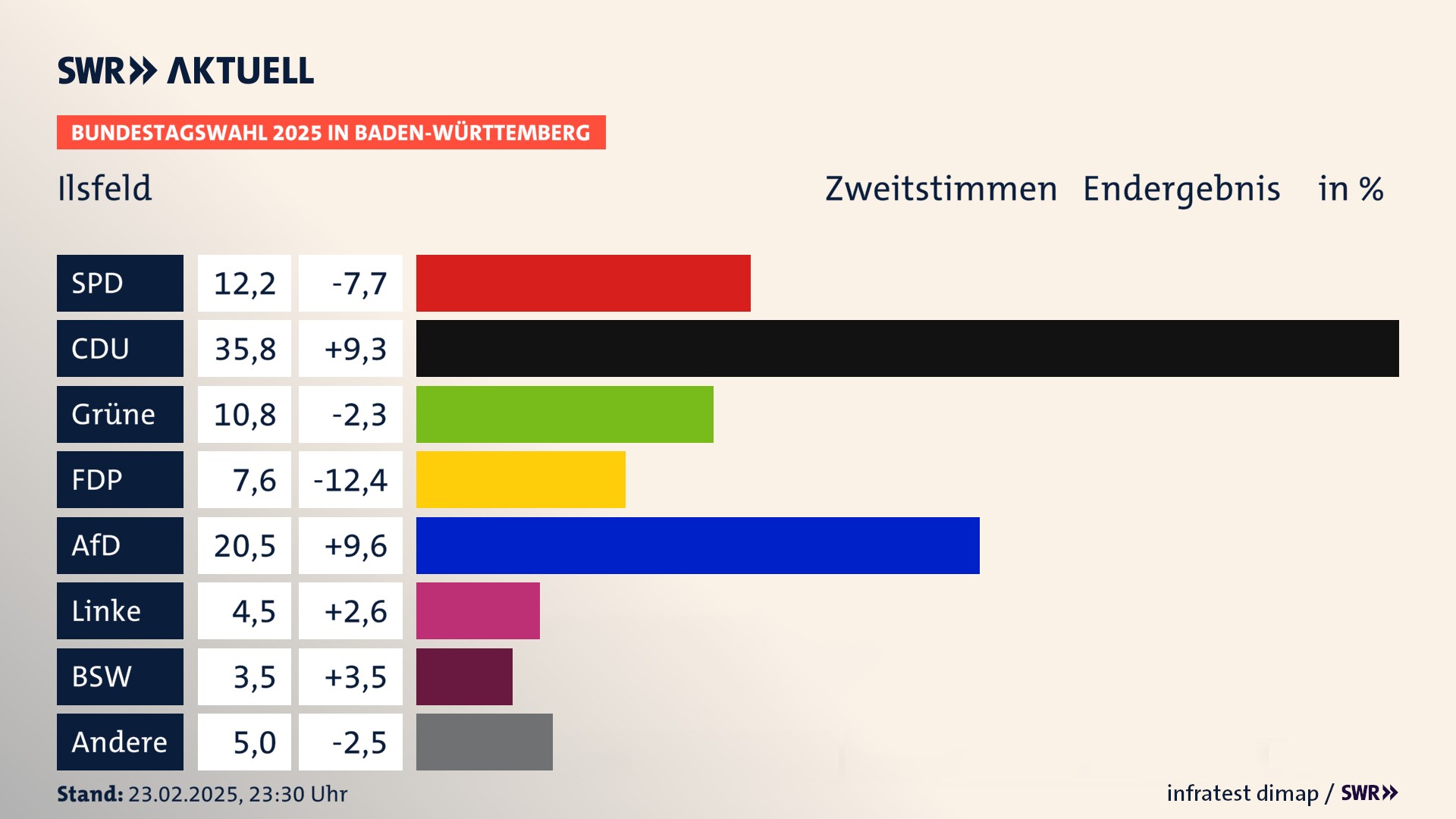 In Ilsfeld verliert die SPD stark (-7,7 Prozentpunkte) und erzielt 12,2 Prozent der gültigen Stimmen. Die CDU erreicht 35,8 Prozent und gewinnt stark (+9,3 Prozentpunkte). Die Grünen erzielen 10,8 Prozent und verlieren leicht (-2,3 Prozentpunkte). Die FDP verliert stark (-12,4 Prozentpunkte) und kommt auf 7,6 Prozent. Die AfD erreicht 20,5 Prozent und gewinnt stark (+9,6 Prozentpunkte). Die Linke erzielt 4,5 Prozent und gewinnt leicht (+2,6 Prozentpunkte). Die 2021 nicht angetretene Partei BSW bekommt 3,5 Prozent.