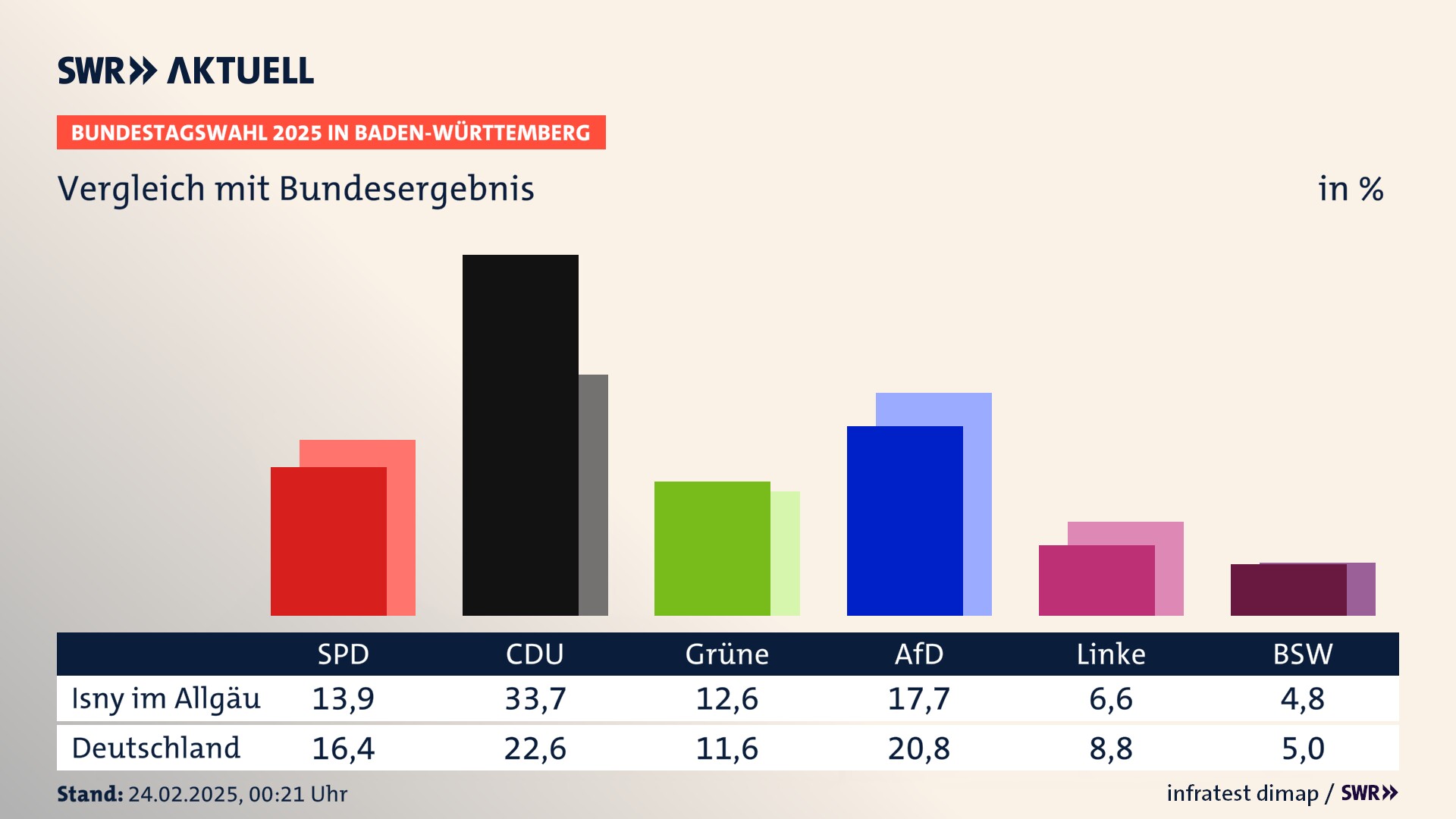 In Isny im Allgäu verliert die SPD stark (-7,6 Prozentpunkte) und erzielt 13,9 Prozent der gültigen Stimmen. Die CDU erreicht 33,7 Prozent und gewinnt stark (+8,2 Prozentpunkte). Die Grünen erzielen 12,6 Prozent und verlieren deutlich (-4,6 Prozentpunkte). Die FDP verliert stark (-8,7 Prozentpunkte) und kommt auf 5,0 Prozent. Die AfD erreicht 17,7 Prozent und gewinnt stark (+10,1 Prozentpunkte). Die Linke erzielt 6,6 Prozent und gewinnt deutlich (+3,0 Prozentpunkte). Die 2021 nicht angetretene Partei BSW bekommt 4,8 Prozent.