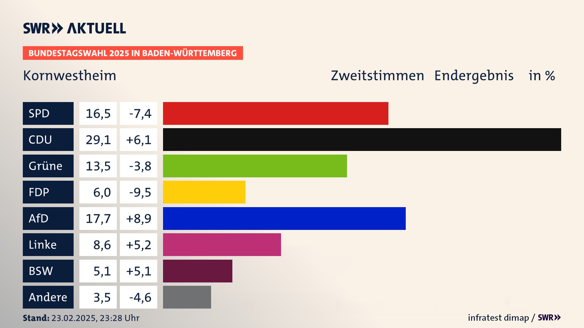 In Kornwestheim verliert die SPD stark (-7,4 Prozentpunkte) und erzielt 16,5 Prozent der gültigen Stimmen. Die CDU erreicht 29,1 Prozent und gewinnt stark (+6,1 Prozentpunkte). Die Grünen erzielen 13,5 Prozent und verlieren deutlich (-3,8 Prozentpunkte). Die FDP verliert stark (-9,5 Prozentpunkte) und kommt auf 6,0 Prozent. Die AfD erreicht 17,7 Prozent und gewinnt stark (+8,9 Prozentpunkte). Die Linke erzielt 8,6 Prozent und gewinnt stark (+5,2 Prozentpunkte). Die 2021 nicht angetretene Partei BSW bekommt 5,1 Prozent.