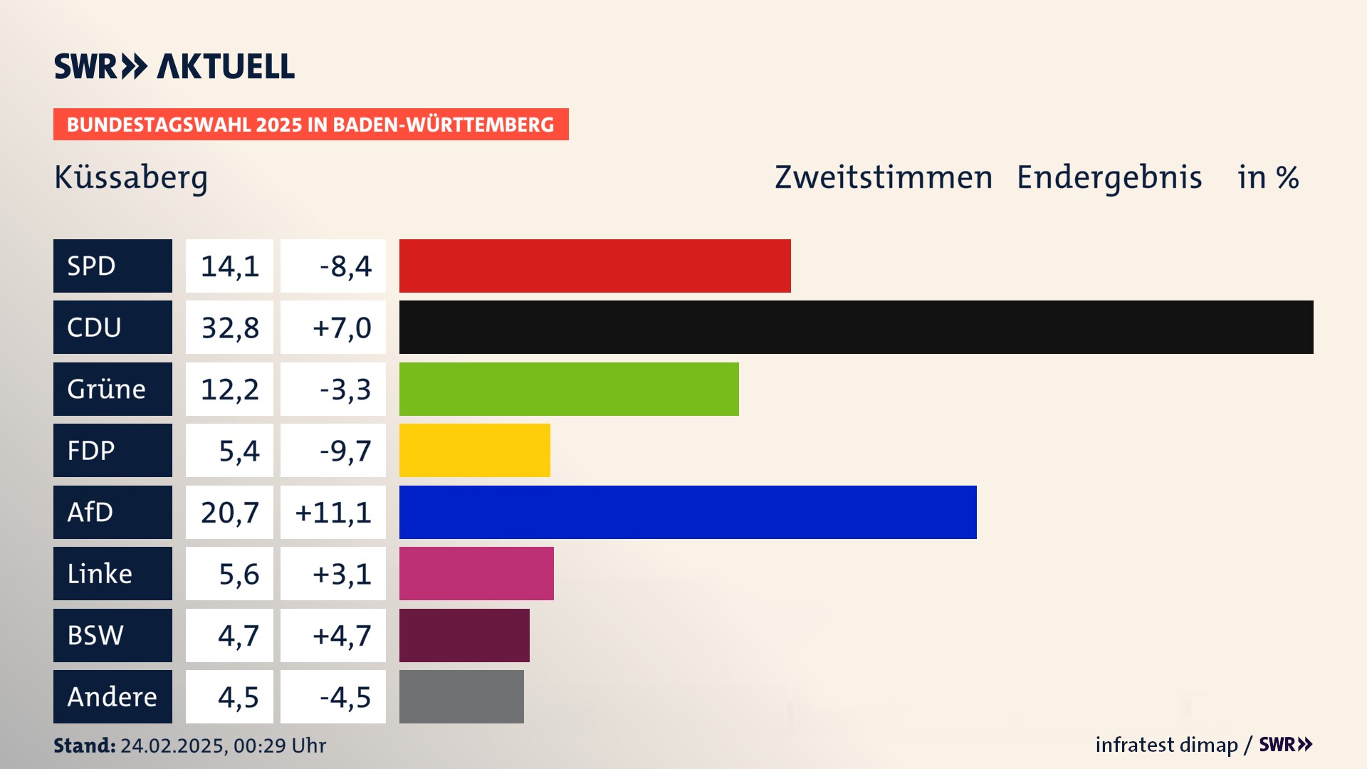 In Küssaberg verliert die SPD stark (-8,4 Prozentpunkte) und erzielt 14,1 Prozent der gültigen Stimmen. Die CDU erreicht 32,8 Prozent und gewinnt stark (+7,0 Prozentpunkte). Die Grünen erzielen 12,2 Prozent und verlieren deutlich (-3,3 Prozentpunkte). Die FDP verliert stark (-9,7 Prozentpunkte) und kommt auf 5,4 Prozent. Die AfD erreicht 20,7 Prozent und gewinnt stark (+11,1 Prozentpunkte). Die Linke erzielt 5,6 Prozent und gewinnt deutlich (+3,1 Prozentpunkte). Die 2021 nicht angetretene Partei BSW bekommt 4,7 Prozent.