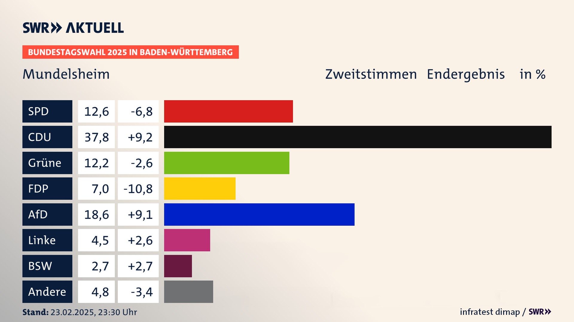 In Mundelsheim verliert die SPD stark (-6,8 Prozentpunkte) und erzielt 12,6 Prozent der gültigen Stimmen. Die CDU erreicht 37,8 Prozent und gewinnt stark (+9,2 Prozentpunkte). Die Grünen erzielen 12,2 Prozent und verlieren leicht (-2,6 Prozentpunkte). Die FDP verliert stark (-10,8 Prozentpunkte) und kommt auf 7,0 Prozent. Die AfD erreicht 18,6 Prozent und gewinnt stark (+9,1 Prozentpunkte). Die Linke erzielt 4,5 Prozent und gewinnt leicht (+2,6 Prozentpunkte). Die 2021 nicht angetretene Partei BSW bekommt 2,7 Prozent.