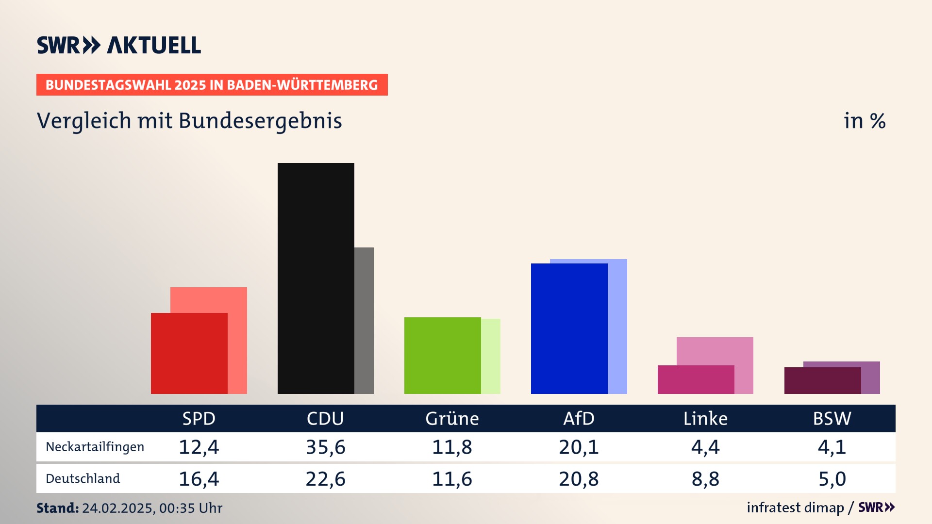 In Neckartailfingen verliert die SPD stark (-7,5 Prozentpunkte) und erzielt 12,4 Prozent der gültigen Stimmen. Die CDU erreicht 35,6 Prozent und gewinnt stark (+8,2 Prozentpunkte). Die Grünen erzielen 11,8 Prozent und verlieren leicht (-2,0 Prozentpunkte). Die FDP verliert stark (-10,6 Prozentpunkte) und kommt auf 6,5 Prozent. Die AfD erreicht 20,1 Prozent und gewinnt stark (+9,5 Prozentpunkte). Die Linke erzielt 4,4 Prozent und gewinnt leicht (+2,1 Prozentpunkte). Die 2021 nicht angetretene Partei BSW bekommt 4,1 Prozent.