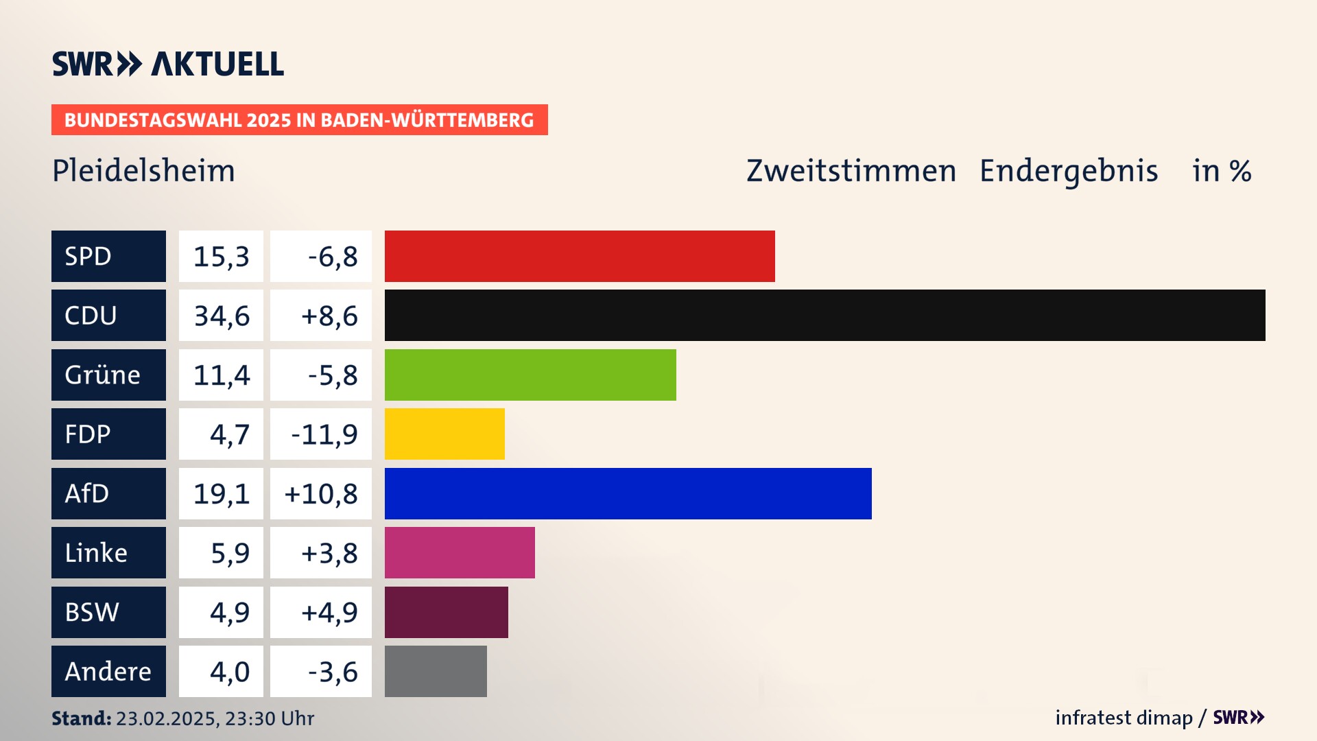 In Pleidelsheim verliert die SPD stark (-6,8 Prozentpunkte) und erzielt 15,3 Prozent der gültigen Stimmen. Die CDU erreicht 34,6 Prozent und gewinnt stark (+8,6 Prozentpunkte). Die Grünen erzielen 11,4 Prozent und verlieren stark (-5,8 Prozentpunkte). Die FDP verliert stark (-11,9 Prozentpunkte) und kommt auf 4,7 Prozent. Die AfD erreicht 19,1 Prozent und gewinnt stark (+10,8 Prozentpunkte). Die Linke erzielt 5,9 Prozent und gewinnt deutlich (+3,8 Prozentpunkte). Die 2021 nicht angetretene Partei BSW bekommt 4,9 Prozent.