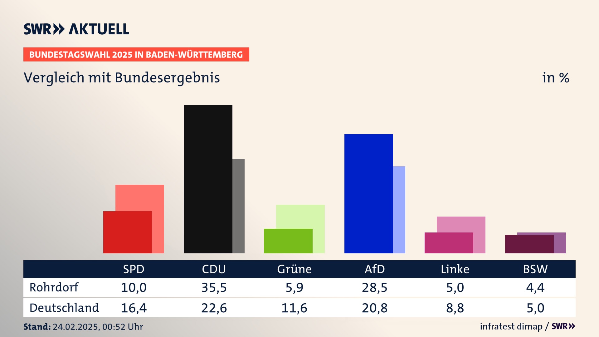 In Rohrdorf verliert die SPD stark (-6,8 Prozentpunkte) und erzielt 10,0 Prozent der gültigen Stimmen. Die CDU erreicht 35,5 Prozent und gewinnt deutlich (+3,4 Prozentpunkte). Die Grünen erzielen 5,9 Prozent und verlieren leicht (-2,1 Prozentpunkte). Die FDP verliert stark (-13,3 Prozentpunkte) und kommt auf 5,5 Prozent. Die AfD erreicht 28,5 Prozent und gewinnt stark (+16,0 Prozentpunkte). Die Linke erzielt 5,0 Prozent und gewinnt leicht (+2,7 Prozentpunkte). Die 2021 nicht angetretene Partei BSW bekommt 4,4 Prozent.
