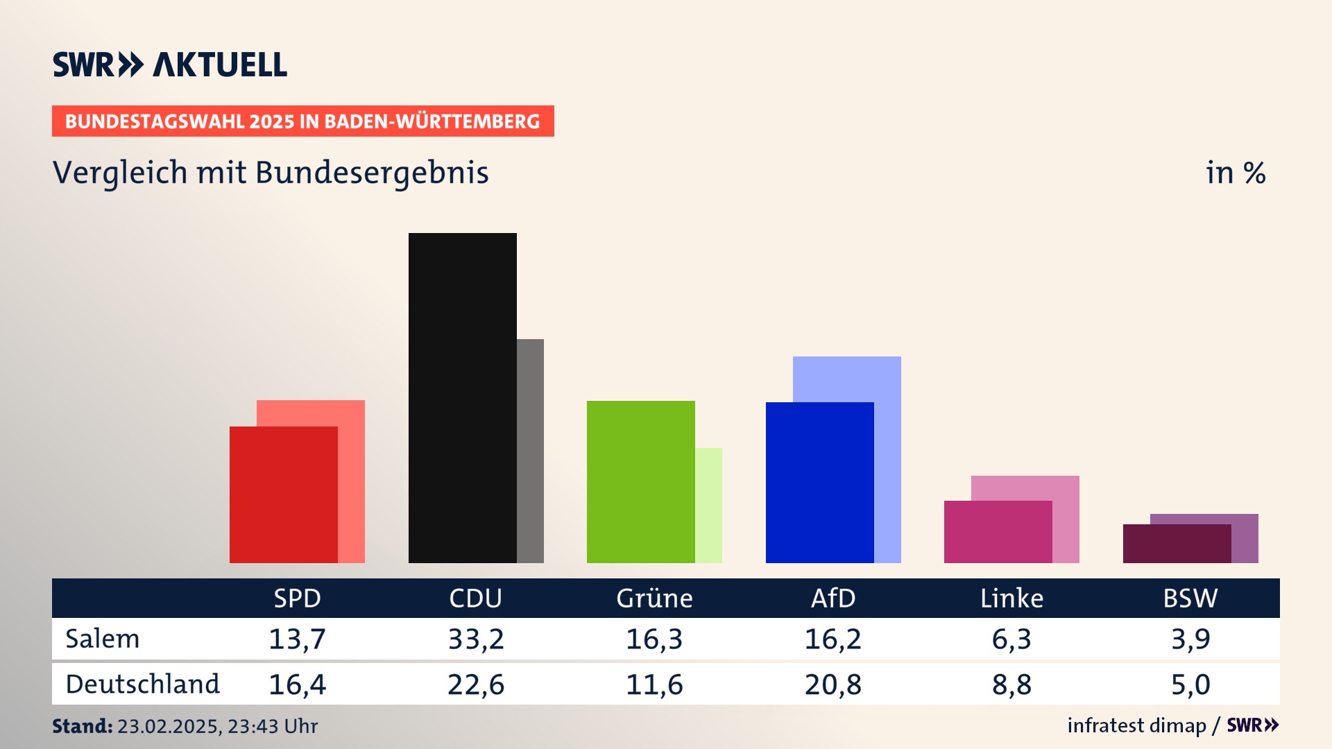 In Salem verliert die SPD stark (-6,6 Prozentpunkte) und erzielt 13,7 Prozent der gültigen Stimmen. Die CDU erreicht 33,2 Prozent und gewinnt stark (+9,5 Prozentpunkte). Die Grünen erzielen 16,3 Prozent und verlieren deutlich (-3,0 Prozentpunkte). Die FDP verliert stark (-10,5 Prozentpunkte) und kommt auf 6,1 Prozent. Die AfD erreicht 16,2 Prozent und gewinnt stark (+8,3 Prozentpunkte). Die Linke erzielt 6,3 Prozent und gewinnt deutlich (+3,1 Prozentpunkte). Die 2021 nicht angetretene Partei BSW bekommt 3,9 Prozent.