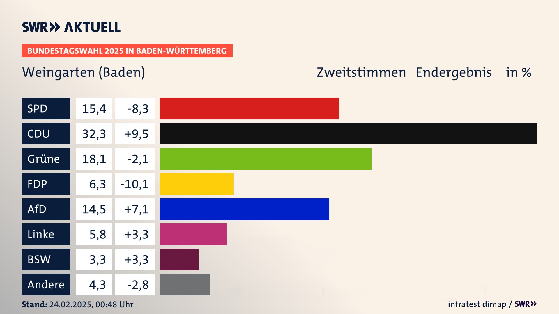 In Weingarten (Baden) verliert die SPD stark (-8,3 Prozentpunkte) und erzielt 15,4 Prozent der gültigen Stimmen. Die CDU erreicht 32,3 Prozent und gewinnt stark (+9,5 Prozentpunkte). Die Grünen erzielen 18,1 Prozent und verlieren leicht (-2,1 Prozentpunkte). Die FDP verliert stark (-10,1 Prozentpunkte) und kommt auf 6,3 Prozent. Die AfD erreicht 14,5 Prozent und gewinnt stark (+7,1 Prozentpunkte). Die Linke erzielt 5,8 Prozent und gewinnt deutlich (+3,3 Prozentpunkte). Die 2021 nicht angetretene Partei BSW bekommt 3,3 Prozent.