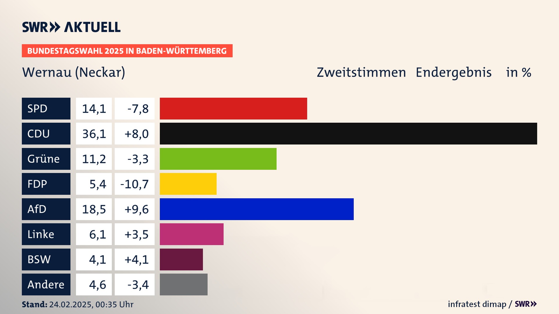 In Wernau (Neckar) verliert die SPD stark (-7,8 Prozentpunkte) und erzielt 14,1 Prozent der gültigen Stimmen. Die CDU erreicht 36,1 Prozent und gewinnt stark (+8,0 Prozentpunkte). Die Grünen erzielen 11,2 Prozent und verlieren deutlich (-3,3 Prozentpunkte). Die FDP verliert stark (-10,7 Prozentpunkte) und kommt auf 5,4 Prozent. Die AfD erreicht 18,5 Prozent und gewinnt stark (+9,6 Prozentpunkte). Die Linke erzielt 6,1 Prozent und gewinnt deutlich (+3,5 Prozentpunkte). Die 2021 nicht angetretene Partei BSW bekommt 4,1 Prozent.
