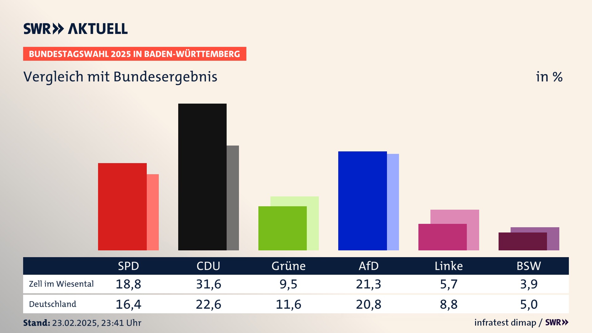In Zell im Wiesental verliert die SPD stark (-8,9 Prozentpunkte) und erzielt 18,8 Prozent der gültigen Stimmen. Die CDU erreicht 31,6 Prozent und gewinnt stark (+6,1 Prozentpunkte). Die Grünen erzielen 9,5 Prozent und verlieren leicht (-2,7 Prozentpunkte). Die FDP verliert stark (-8,8 Prozentpunkte) und kommt auf 4,0 Prozent. Die AfD erreicht 21,3 Prozent und gewinnt stark (+11,9 Prozentpunkte). Die Linke erzielt 5,7 Prozent und gewinnt leicht (+2,9 Prozentpunkte). Die 2021 nicht angetretene Partei BSW bekommt 3,9 Prozent.