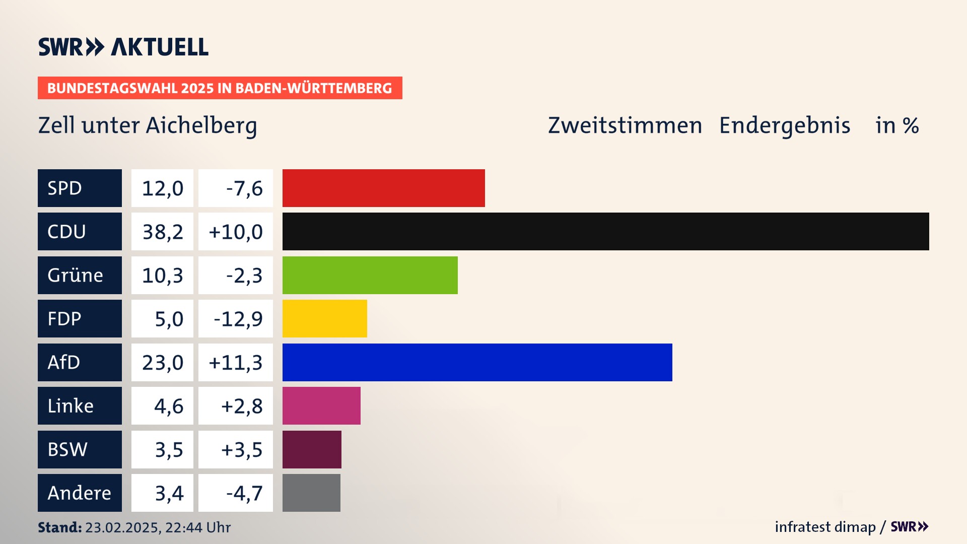 In Zell unter Aichelberg verliert die SPD stark (-7,6 Prozentpunkte) und erzielt 12,0 Prozent der gültigen Stimmen. Die CDU erreicht 38,2 Prozent und gewinnt stark (+10,0 Prozentpunkte). Die Grünen erzielen 10,3 Prozent und verlieren leicht (-2,3 Prozentpunkte). Die FDP verliert stark (-12,9 Prozentpunkte) und kommt auf 5,0 Prozent. Die AfD erreicht 23,0 Prozent und gewinnt stark (+11,3 Prozentpunkte). Die Linke erzielt 4,6 Prozent und gewinnt leicht (+2,8 Prozentpunkte). Die 2021 nicht angetretene Partei BSW bekommt 3,5 Prozent.